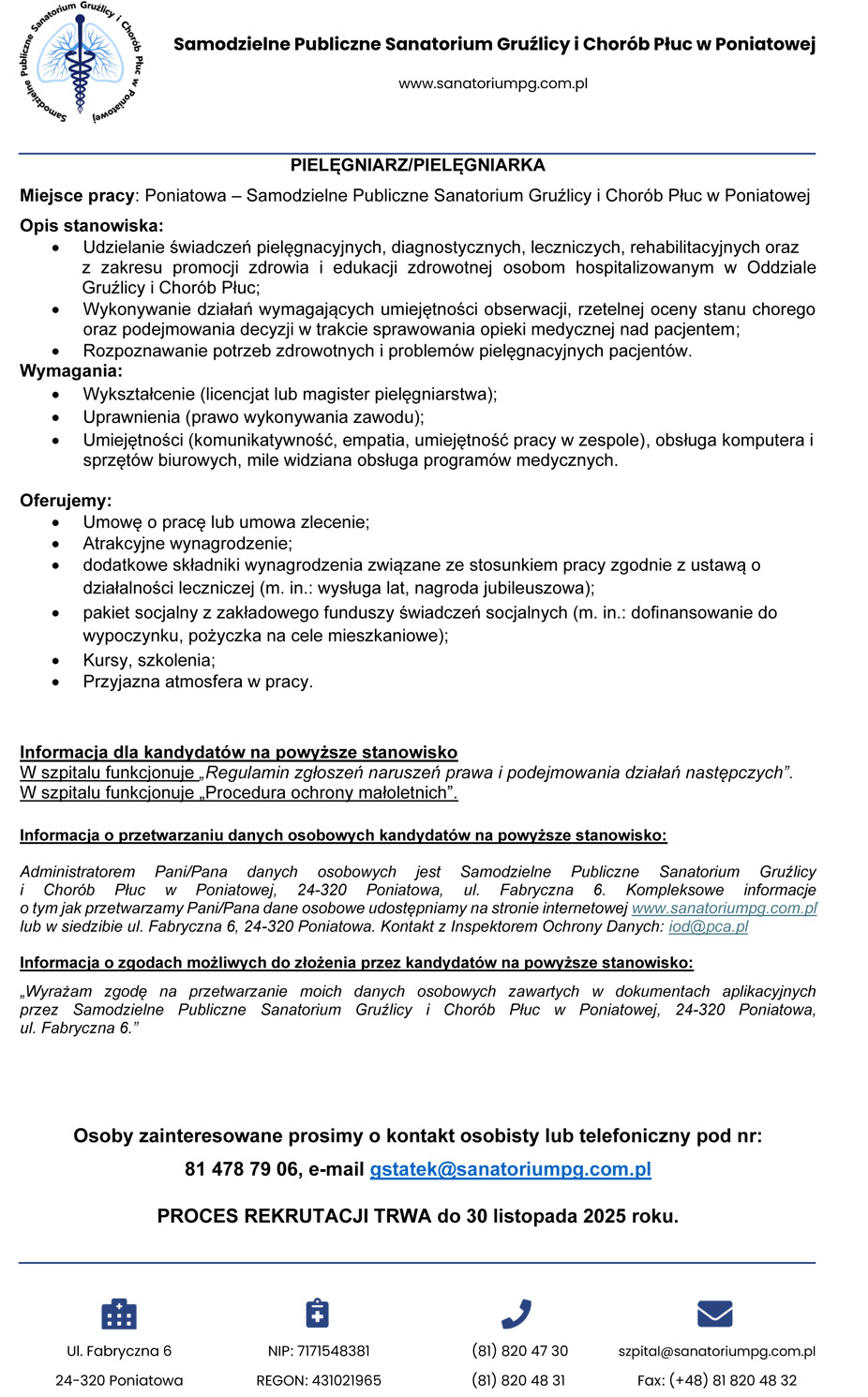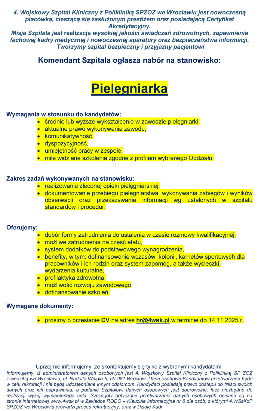 - wykształcenie średnie medyczne lub wyższe - pielęgniarstwo,